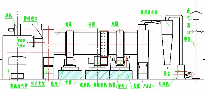 干燥的濕物料由皮帶輸送機(jī)或斗式提升機(jī)送到料斗,然后經(jīng)料斗的加料機(jī)通過加料管道進(jìn)入加料端。加料管道的斜度要大于物料的自然傾角,以便物料順利流入干燥器內(nèi)。干燥器圓筒是一個與水平線略成傾斜的旋轉(zhuǎn)圓筒。物料從較高一端加入,載熱體由低端進(jìn)入,與物料成逆流接觸,也有載熱體和物料一起并流進(jìn)入筒體的。隨著圓筒的轉(zhuǎn)動物料受重力作用運(yùn)行到較底的一端。濕物料在筒體內(nèi)向前移動過程中,直接或間接了載熱體的給熱,使?jié)裎锪系靡愿稍?,然后在出料端?jīng)皮帶機(jī)或螺旋輸送機(jī)送出。在筒體內(nèi)壁上裝有抄板,它的作用是把物料抄起來又撒下,使物料與氣流的接觸表面增大,以提高干燥速率并促進(jìn)物料前進(jìn)。載熱體一般分為熱空氣、煙道氣等。載熱體經(jīng)干燥器以后,一般需要旋風(fēng)除塵器將氣體內(nèi)所帶物料捕集下來。如需進(jìn)一步減少尾氣含塵量,還應(yīng)經(jīng)過袋式除塵器或濕法除塵器后再放排放。