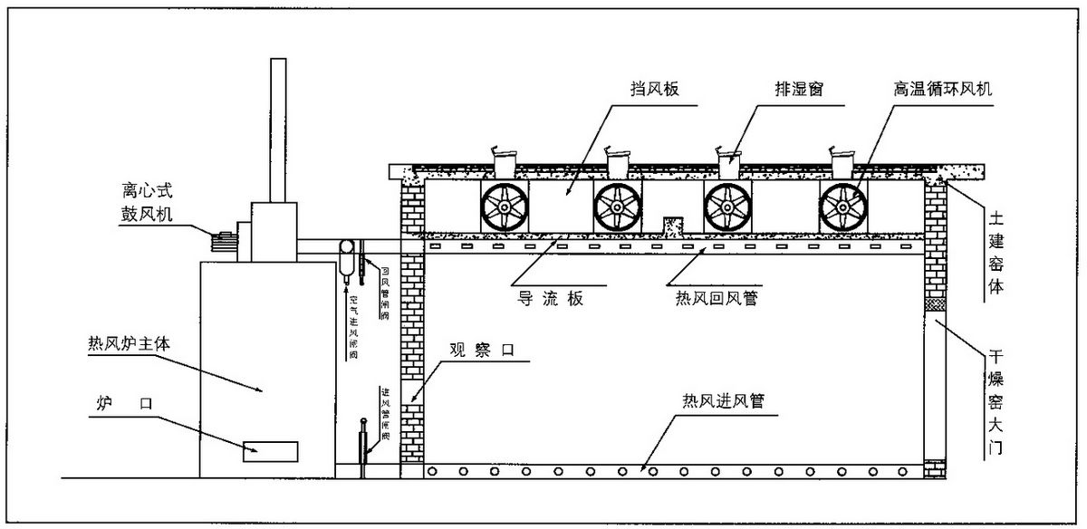 熱風(fēng)式干燥設(shè)備工作原理是利用燃燒產(chǎn)生的熱能,加熱窯內(nèi)的空氣,由熱風(fēng)爐頂部主風(fēng)機(jī)將窯內(nèi)的空氣通過管道吸入爐體,將空氣加熱。再通過管道,送入窯內(nèi),由窯內(nèi)的循環(huán)風(fēng)機(jī)不斷的循環(huán)對窯內(nèi)的木材均勻加熱。木材干燥過程中如需要蒸汽,可由熱風(fēng)爐內(nèi)的蒸汽發(fā)生器提供,如果是一爐兩房或多房時(shí),管道上裝有插閥,通過插閥的調(diào)節(jié)來控制窯內(nèi)的溫度。在干燥的過程中,由于木材要進(jìn)行排濕,在窯頂上留有排濕孔(根據(jù)地區(qū)而定)和裝有抽濕機(jī),用來調(diào)節(jié)排濕的快慢.